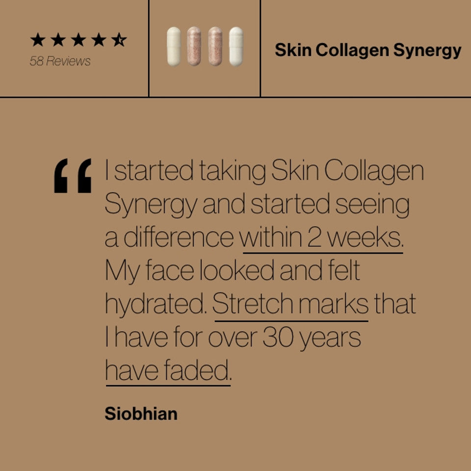 Skin Collagen Synergy is a science-led supplement to help support your own internal collagen formation*, delivering renewed resilience.