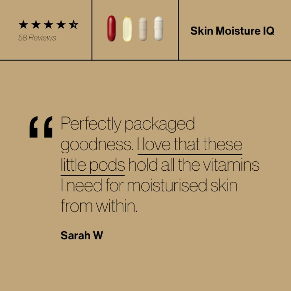 NEW & IMPROVED Skin Moisture IQ is a science-led, 28-day smart supplement system uniquely formulated to hydrate dry and dehydrated skin. Now even more powerful with elevated hyaluronic acid matrix in Skin Moisture Lock™ and validated by new research studies showing 34% improvement in skin hydration