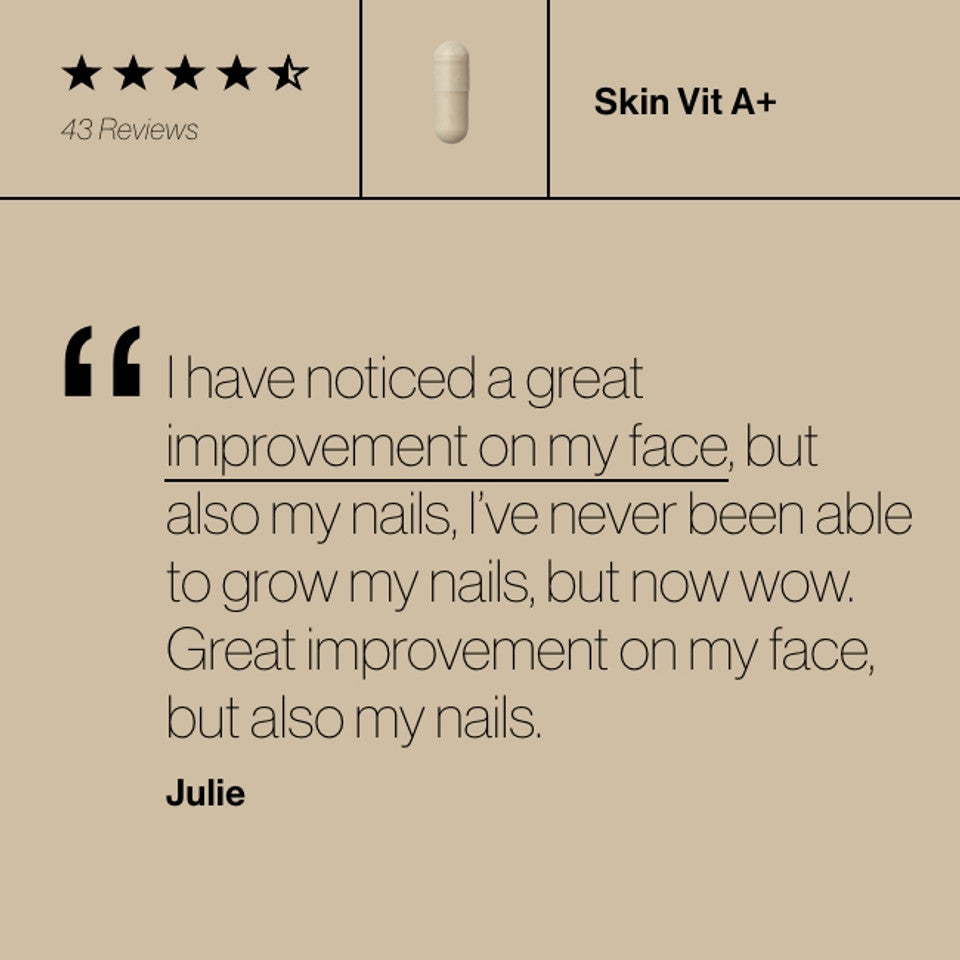 Suitable for all ages and skin types. Skin Vit A+ is an excellent introduction to supplementation and provides over-arching benefits to the skin and overall wellbeing of our bones, muscles and immune system**.